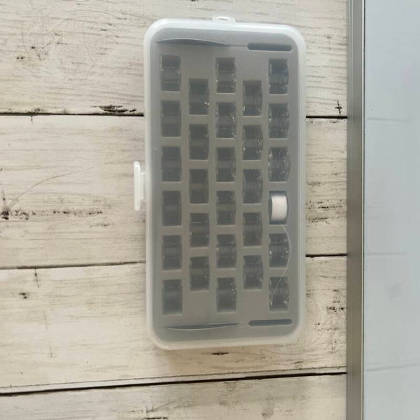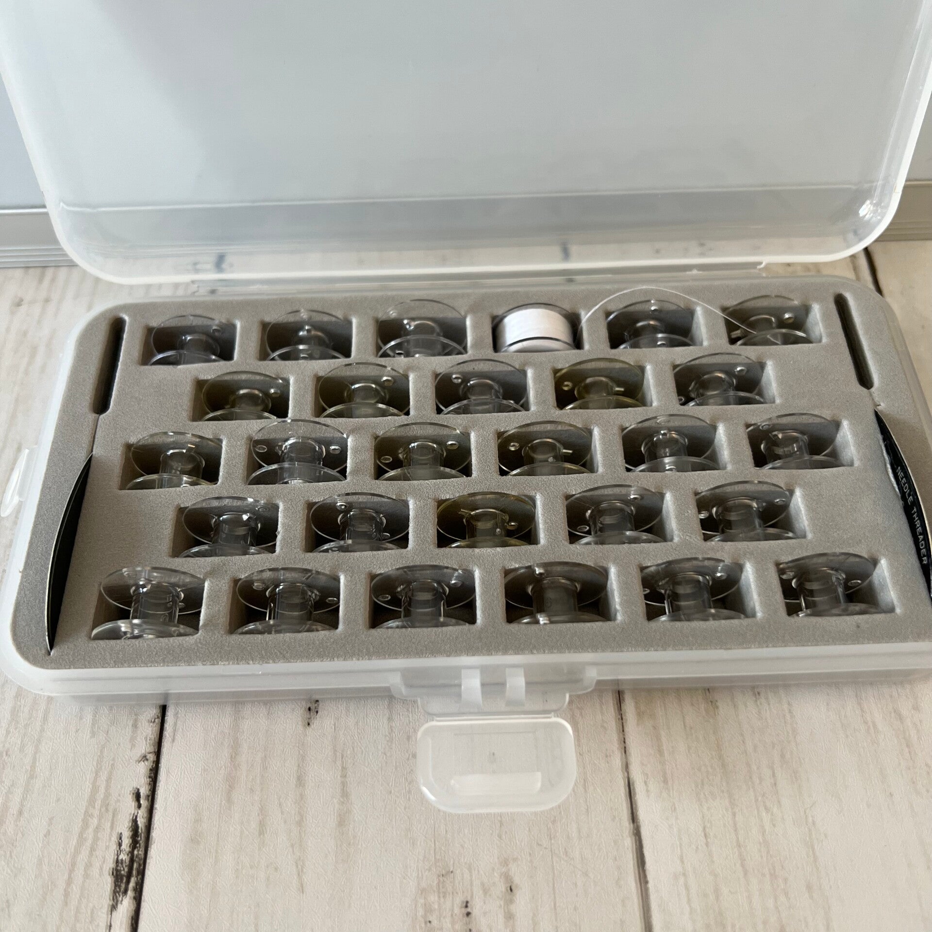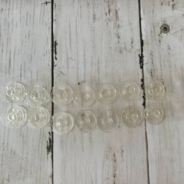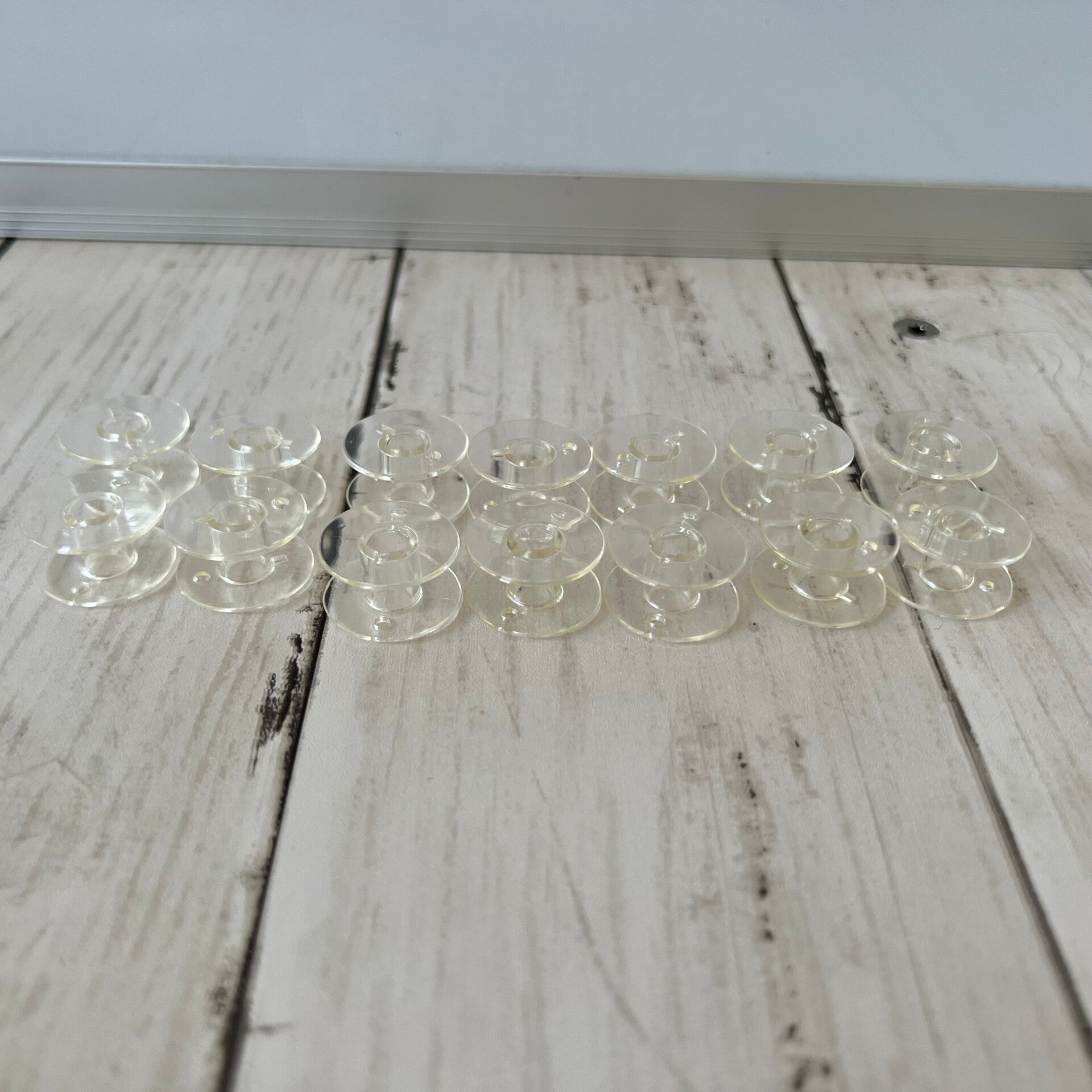 28 leere Spulen aus Kunststoff.