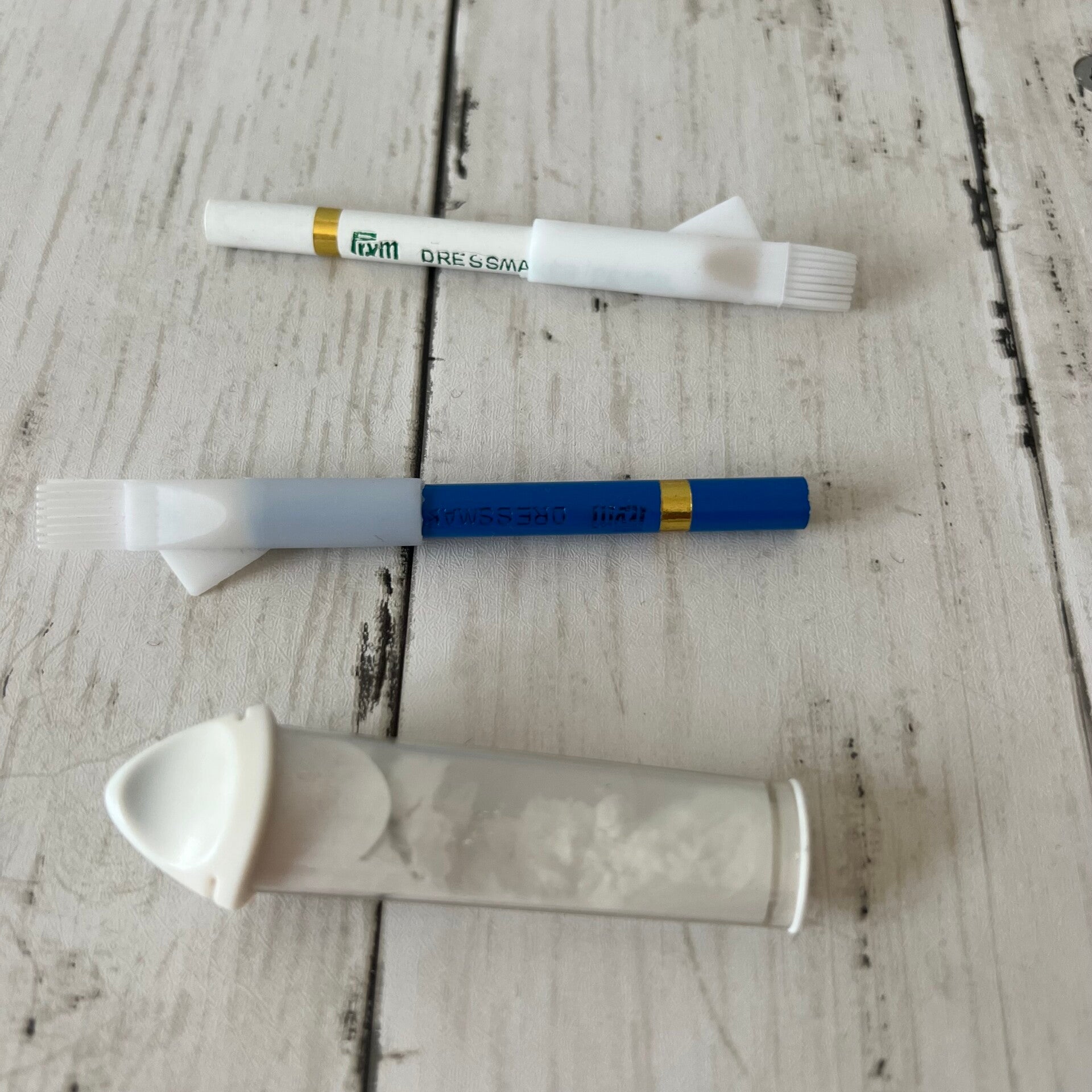 Prym Marker, wenig benutzt.Diverse Kreide Stifte, benutzt.Biegbare Messstreifen, benutzt aber guter Zustand.Nahtauftrenner.Schwarzes dingsbums, noch nie benutzt.Magnetblock mit Kunststoff Hülle für Stecknadeln.